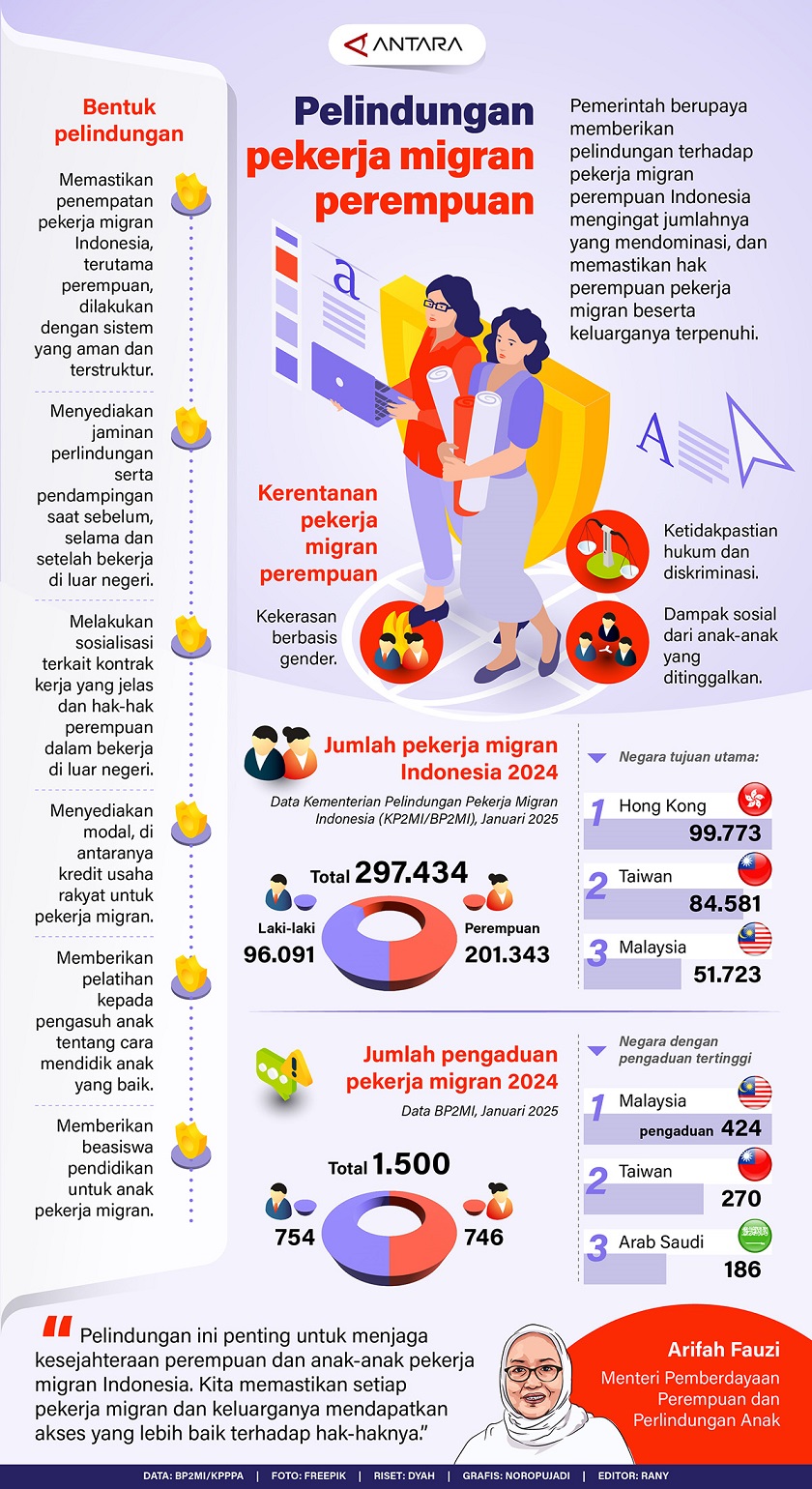 Pemerintah berupaya memberikan pelindungan terhadap pekerja migran perempuan Indonesia mengingat jumlahnya yang mendominasi, dan memastikan hak perempuan pekerja migran beserta keluarganya terpenuhi. ANTARA